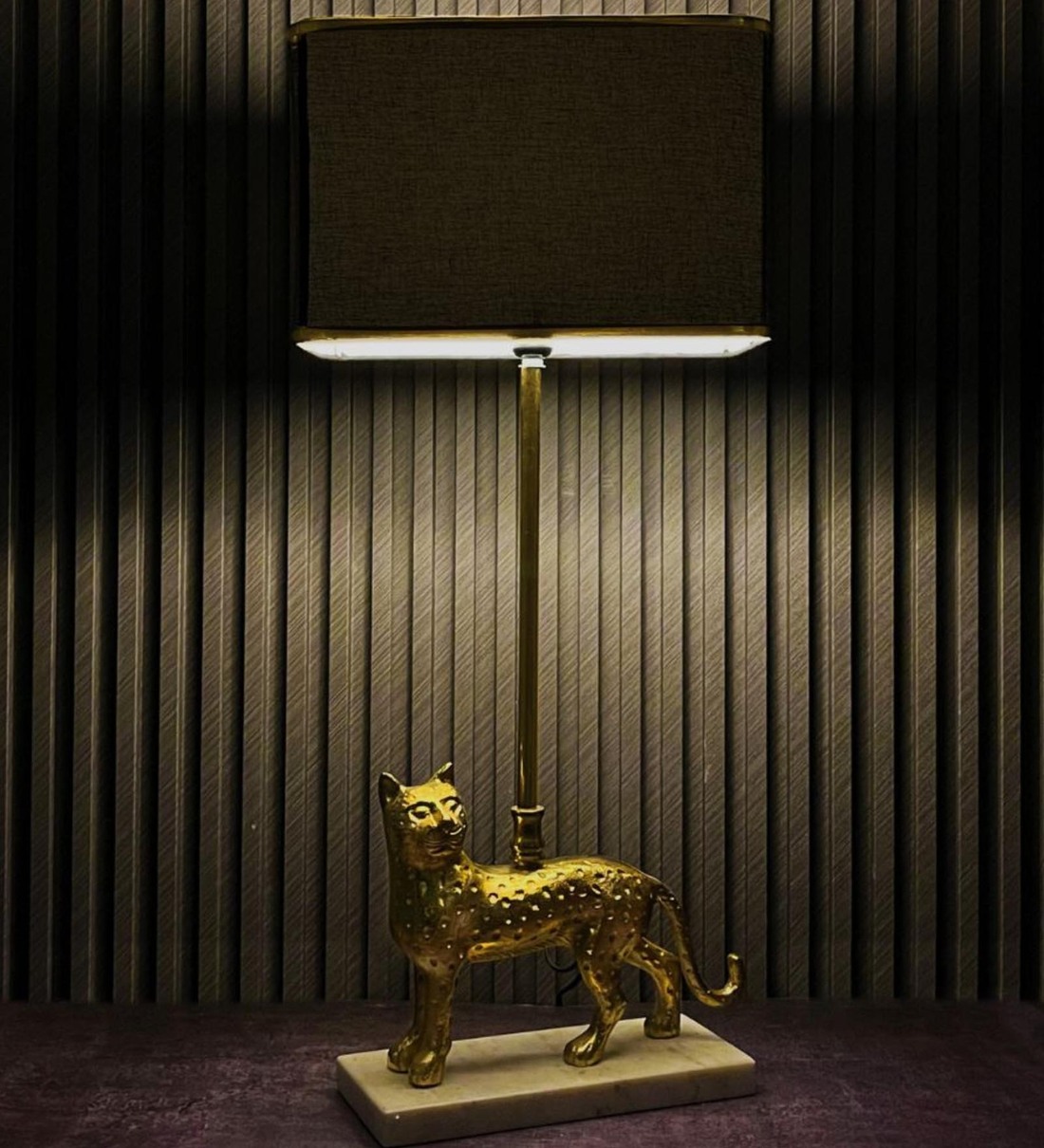 A very detailed model of a ferocious cheetah makes this table lamp a quirky addition to your room, a statement on its own. The gold finish adds an element of opulence, topped off with a black cotton rectangle shade for a timeless look. Topped on a marble base, this tropical lamp gives the much-needed glam to your space.