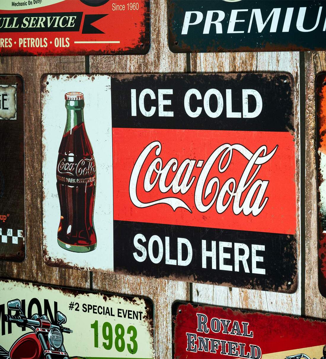Big wall sign Ice Cold Cocacola sold Here Number Plate