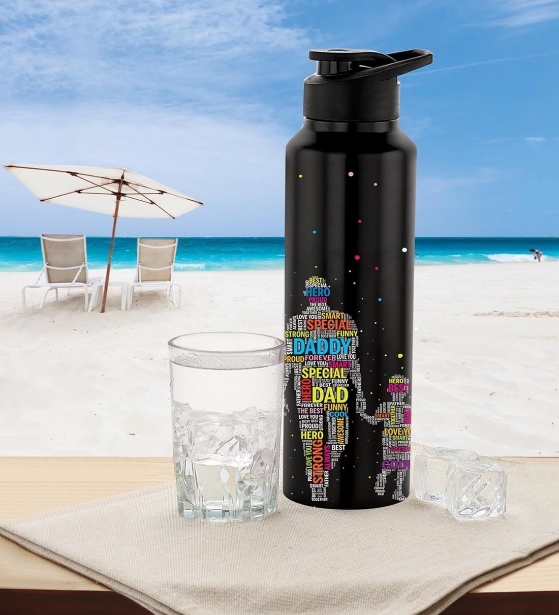 Black 1000ml Classic Flip UV Dad Printed Single Wall Stainless Steel Sipper Cap Water Bottle