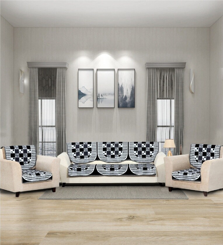 Black 5 Seater Checkered 10Pcs Sofa Covers