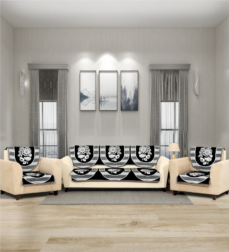 Black 5 Seater Floral 10Pcs Sofa Covers