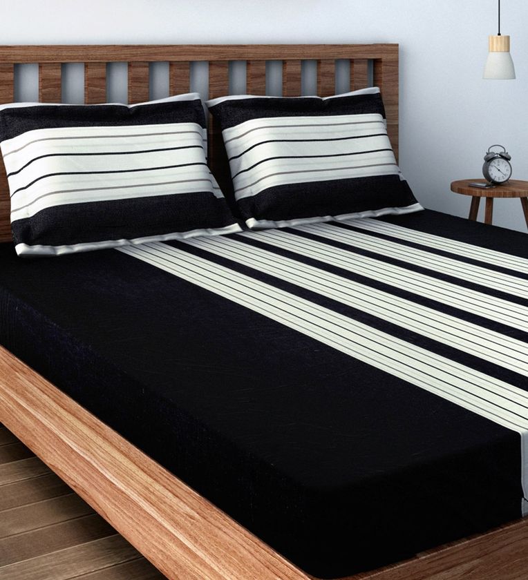 Black and White Cotton Striped 180TC Fitted Queen Bedsheet with 2 Pillow Covers