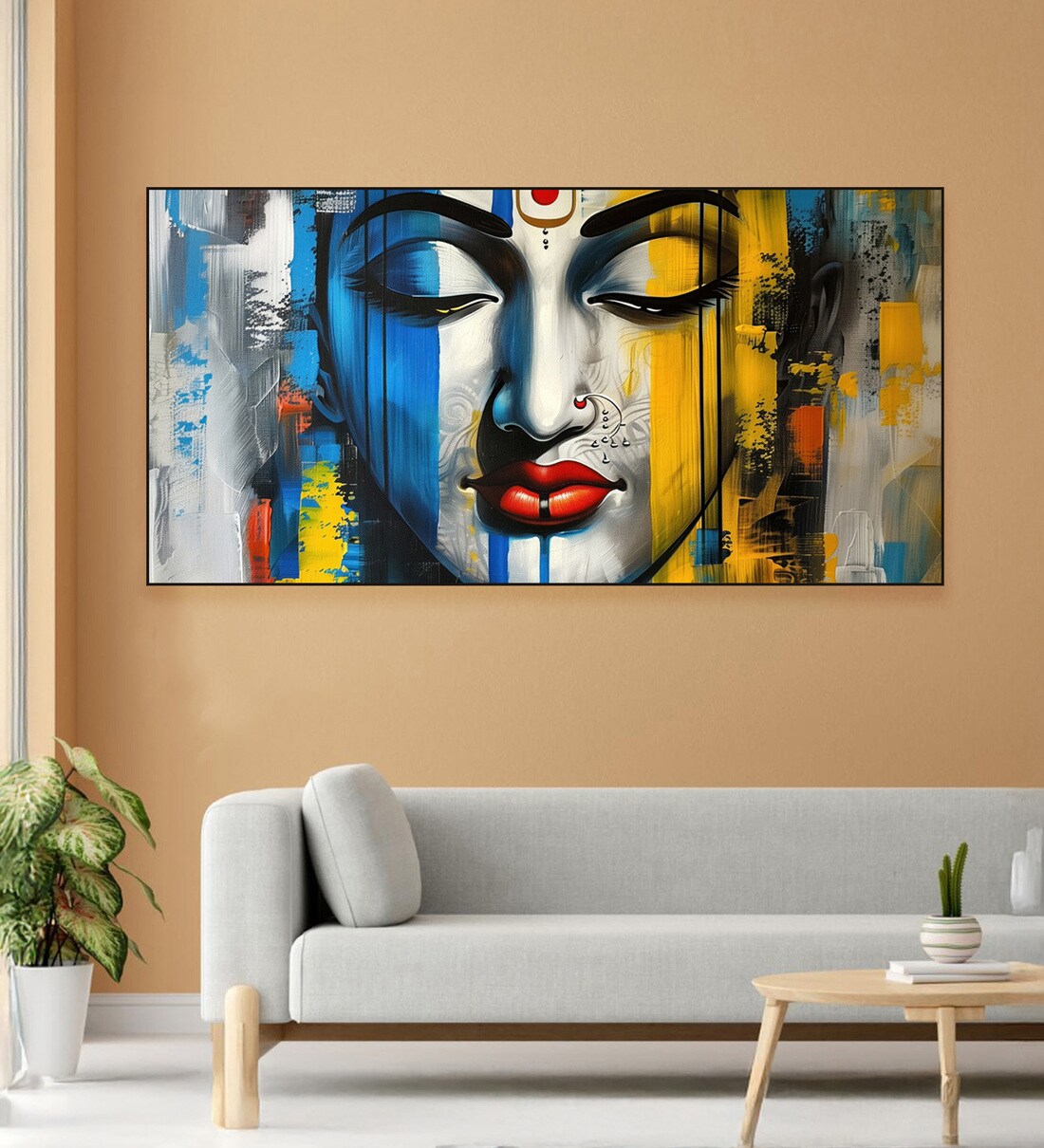 This captivating painting features Shiva's face, elegantly rendered against a striking blue and yellow background that evokes a sense of vibrancy and energy. The use of blue symbolizes tranquility and depth, while the yellow infuses the artwork with warmth and positivity, creating a harmonious balance that draws the viewer in. The woman's expression is both serene and contemplative, inviting reection and connection. In terms of Vaastu, this artwork can enhance the ambiance of a room, particularly when placed in the northeast or east direction, as it promotes a sense of peace and encourages creativity. The vibrant colors not only enliven the space but also contribute to a positive energy ow, making it an ideal addition to living areas, meditation spaces, or creative studios. This painting serves not only as a visual focal point but also as a source of inspiration and tranquility within your home