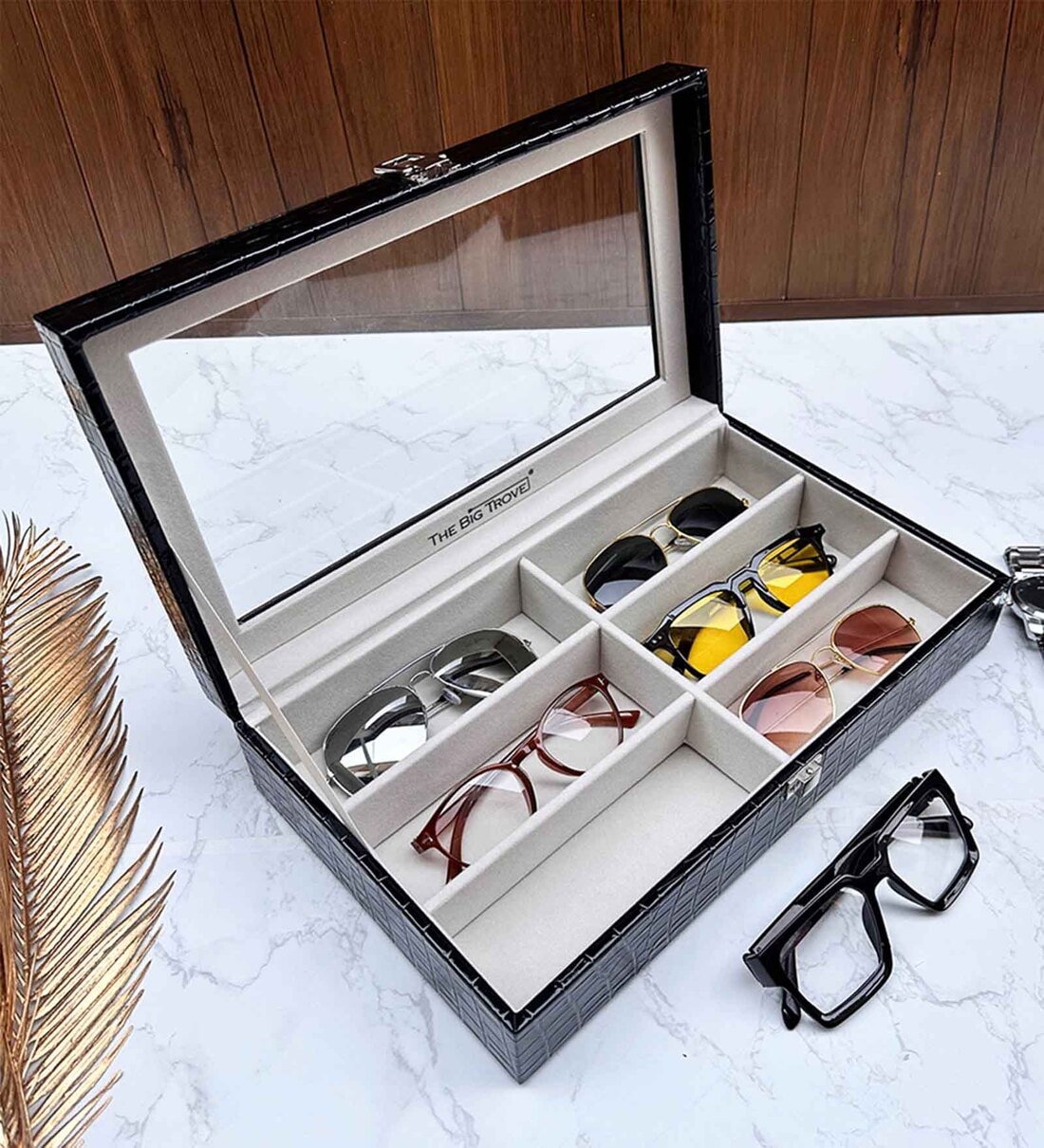Black Elegant 6 Slot Sunglass Box With Glass Top