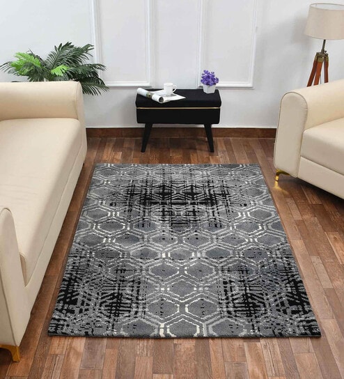 Black Geometric Polyester 4 x 6 Feet Machine Made Carpet