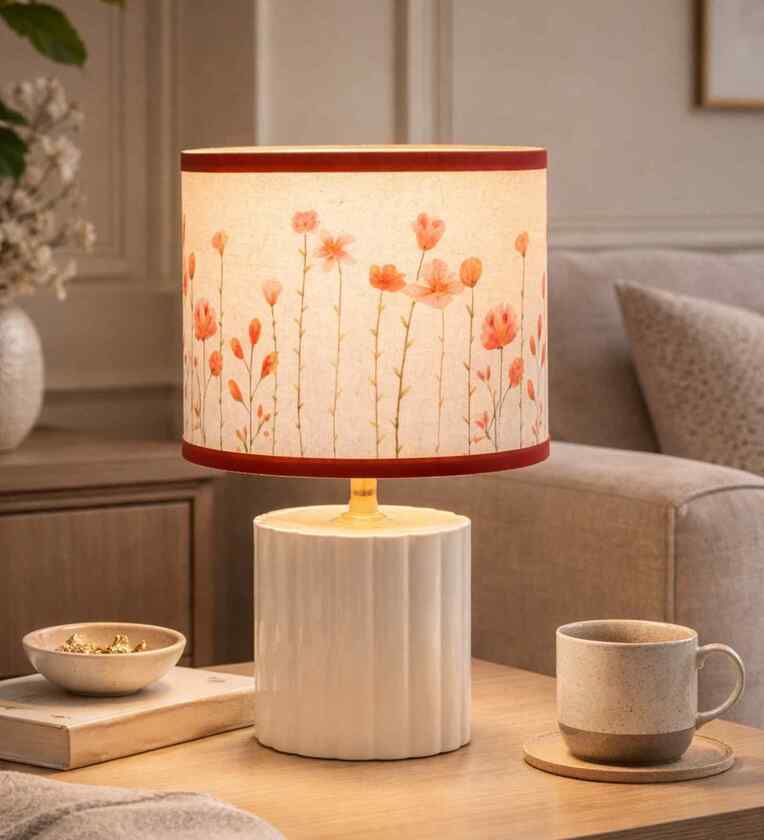 Add a warm and stylish touch to your space with this elegant metal table lamp. Featuring a sturdy metal base and a beautifully printed fabric lampshade, it provides soft ambient lighting (200 400 lumens), perfect for bedrooms, living rooms, or study areas. Designed with an E-27 bulb base for easy compatibility, the lamp comes complete with 1 lampshade, 1 base, 1 bulb, holder & shade ring, and a convenient on-off switch for smooth operation. A perfect blend of functionality and decor.