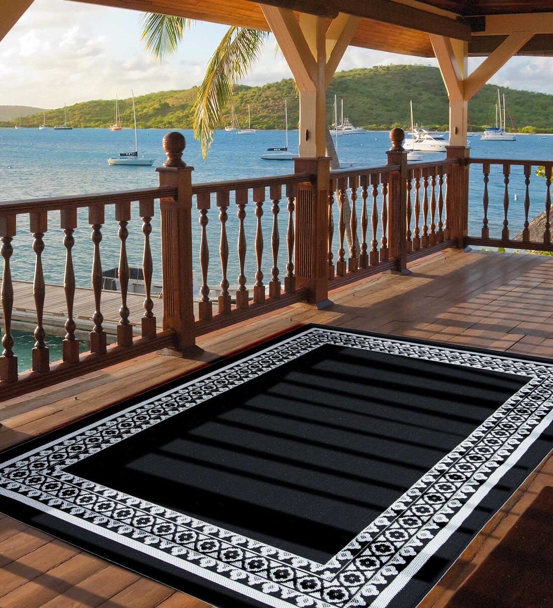 FLORIDA Outdoor Indoor area rug BLACK - 10 X 710. Beautifully crafted rug for your living room, patio , balconies , veranda and outdoor space. Versatile flat woven construction using premium polypropylene yarns. Manufactured using Belgian technology on Wilton looms. Easy care. Water resistant, does not smell due to absorption of water during rainy seasons. Quick Dry.
