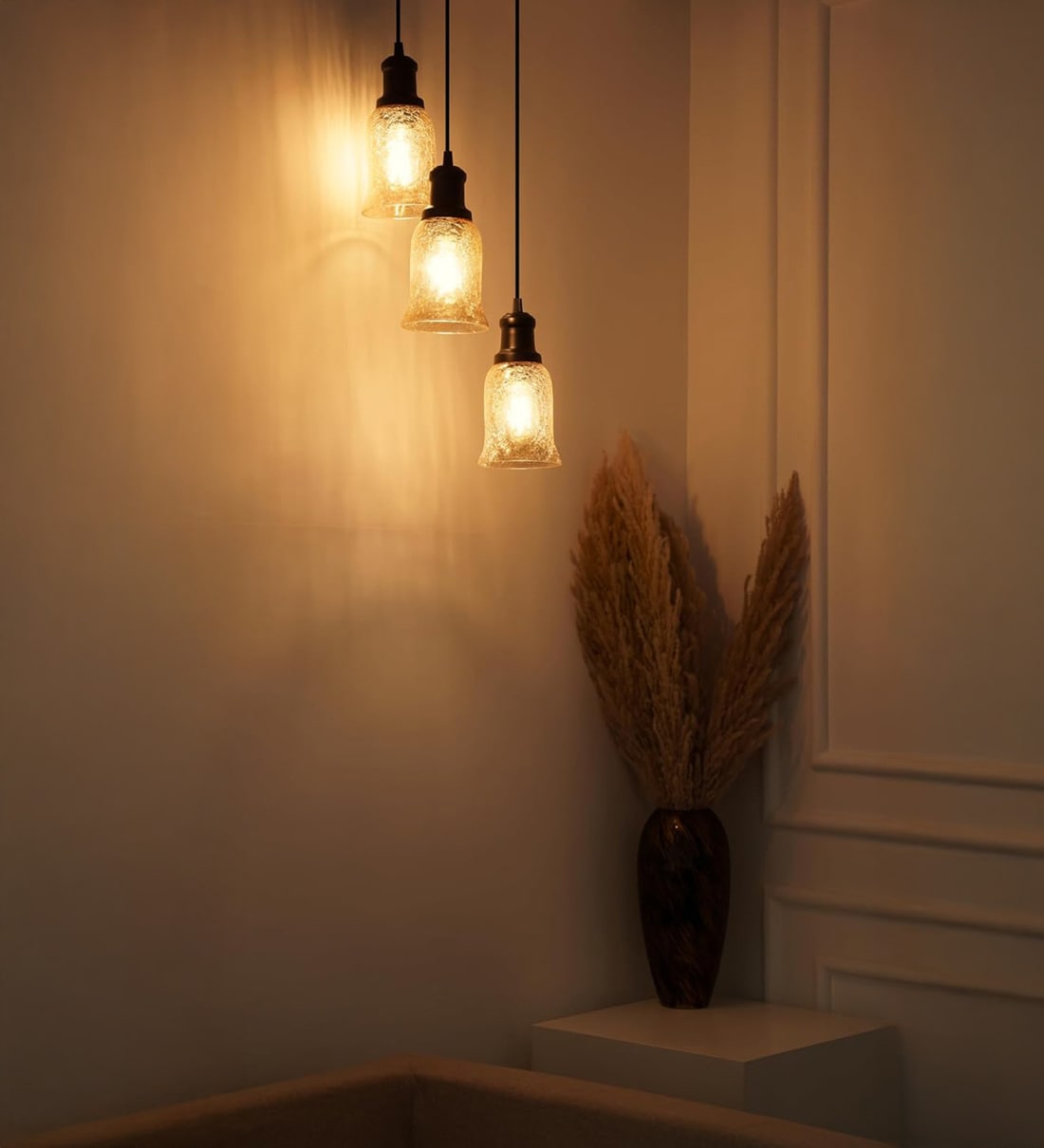 HEIGHT: WIRE LENGTH IS ADJUSTABLE UPTO 1MTR(100 CM) Enhance the interiors of your space with this timeless & elegant Hanging Light. The lamp gives a stylish look to your space while adding a touch of grandeur. This lamp provides sufficient lighting to brighten the corners of your room and delivers diffused illumination which sets the ambience and the mood of your space. It is made in our factory in India. Great With Modern Home Decor: This hanging lamp helps to brighten up the room and has a contemporary design that matches perfectly with the furniture. Features: Can easily blend in indoor spaces like living room, bedroom, side table, lobby area, dinning table, bar area & kitchen, and outdoor spaces like balconies, terrace, patios and outdoor walls. This lamp comes with a Metal Base, Sturdy Frame, Strong Glass and Elegant Finish. Unrivalled Quality - We follow precise quality control measures to ensure that the product(s) you receive are of the highest quality. In the rarest cases that you receive a damaged/ defective product, please reach out to us and let us resolve your issue to the best of our capabilities. Recommended Uses - This lamp is an ideal decor piece for indoor areas like bedroom, living room, dinning room, lobbies, side table, bar and kitchen; and outdoor spaces like patios, outdoor walls, terrace and balconies. It is also an excellent buy for offices, restaurants, cafes, hotels and showrooms.