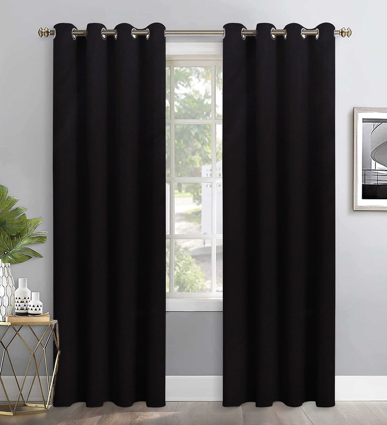 Black Polyester Solid 7ft Blackout Eyelet Door Curtain (2 Pc)