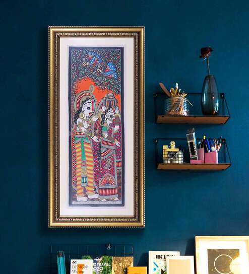 RADHA KRISHNA MADHUBANI: A Symbol of love and selflessness, brings joy, love and blessings of Lord Krishna to your home. The work is very intricate with fine lines with environment friendly green water color medium which depicts the finesse of the artist. Beautifully framed in antique finish golden frame.