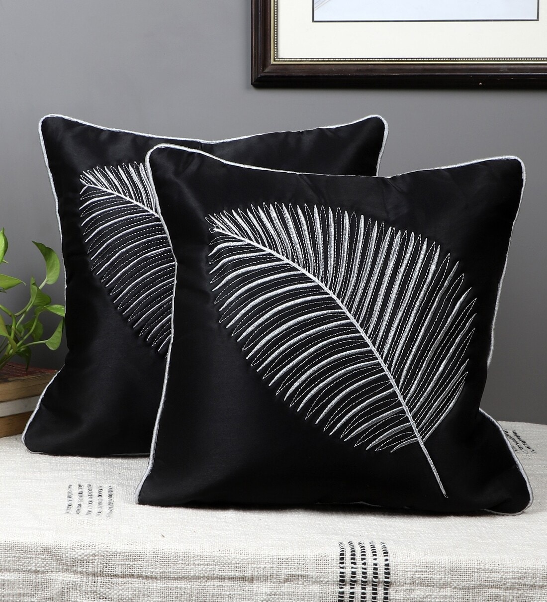 Black Satin Textured 16x16 inches Cushion Covers (Pack of 2)