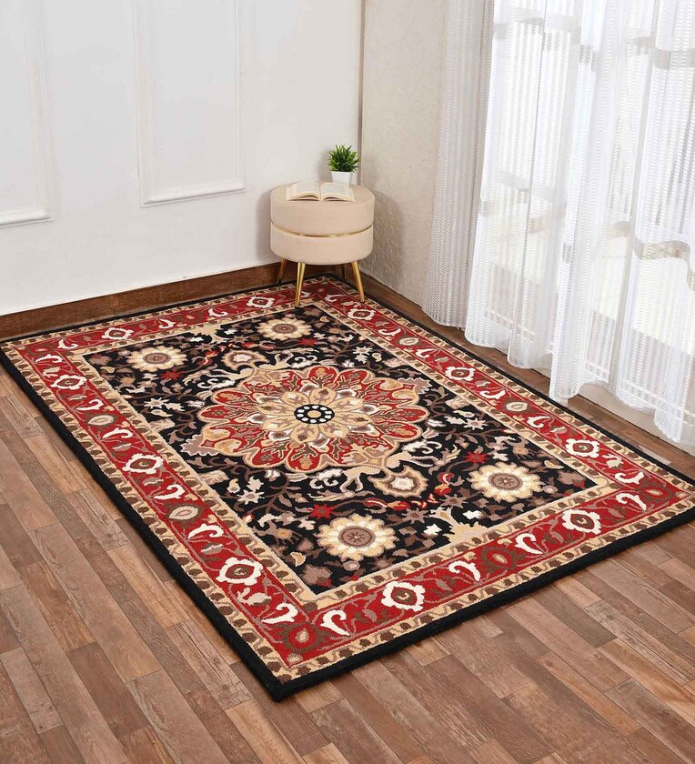 Black Traditional Wool 5 ft x 7 ft Hand Tufted Carpet