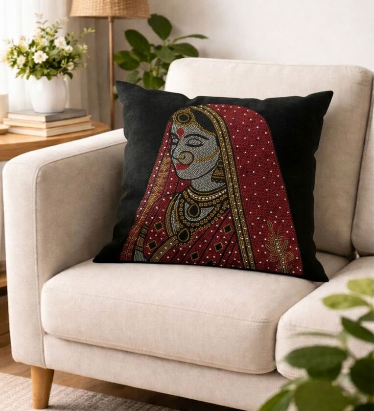 Brighten up floor seating, sofas, or diwan spaces with our elegant swarovski style velvet cushion covers (square). Hidden zipper closure for a Flawless Finish: Expertly crafted with a hidden zipper, these stonework cushion covers deliver a smooth, uninterrupted silhouette that elevates their refined, luxurious appeal. The discreet closure preserves the clean aesthetic while allowing effortless cushion insertion and removal. Finished with precision stitching and reinforced seams, each piece reflects exceptional craftsmanship designed for sophisticated Home Decor, Stonework. Decor Statement for Luxury & Modern Interiors: More than just accessories, these cushion covers serve as refined Decor accents that instantly elevate beds, sofas, diwans, and lounge spaces into designer-inspired settings. The subtle velvet fabric paired with swarovski work creates a sophisticated, hotel-like ambiance, making them ideal for contemporary homes, luxury apartments, and thoughtfully curated interiors. Velvet Cushion Cover with Ultra-Soft Comfort: Crafted from ultra-fine fabric that delivers exceptional smoothness with enhanced durability, these cushion covers offer a luxuriously soft, cloud-like touch. Gentle against the skin yet structured in form, they retain their elegant appearance while providing lasting comfort over time. Exclusive Prints with Timeless Artistic Appeal - Royal Queen: Our curated designer collection brings refined artistry into your home. From elegant classics to majestic horse motifs, each design is thoughtfully developed to create a distinctive Decor statement. Engineered with advanced color-lock technology, the prints retain their vibrancy over time, resisting fading even after multiple washes while maintaining a premium, sophisticated look.