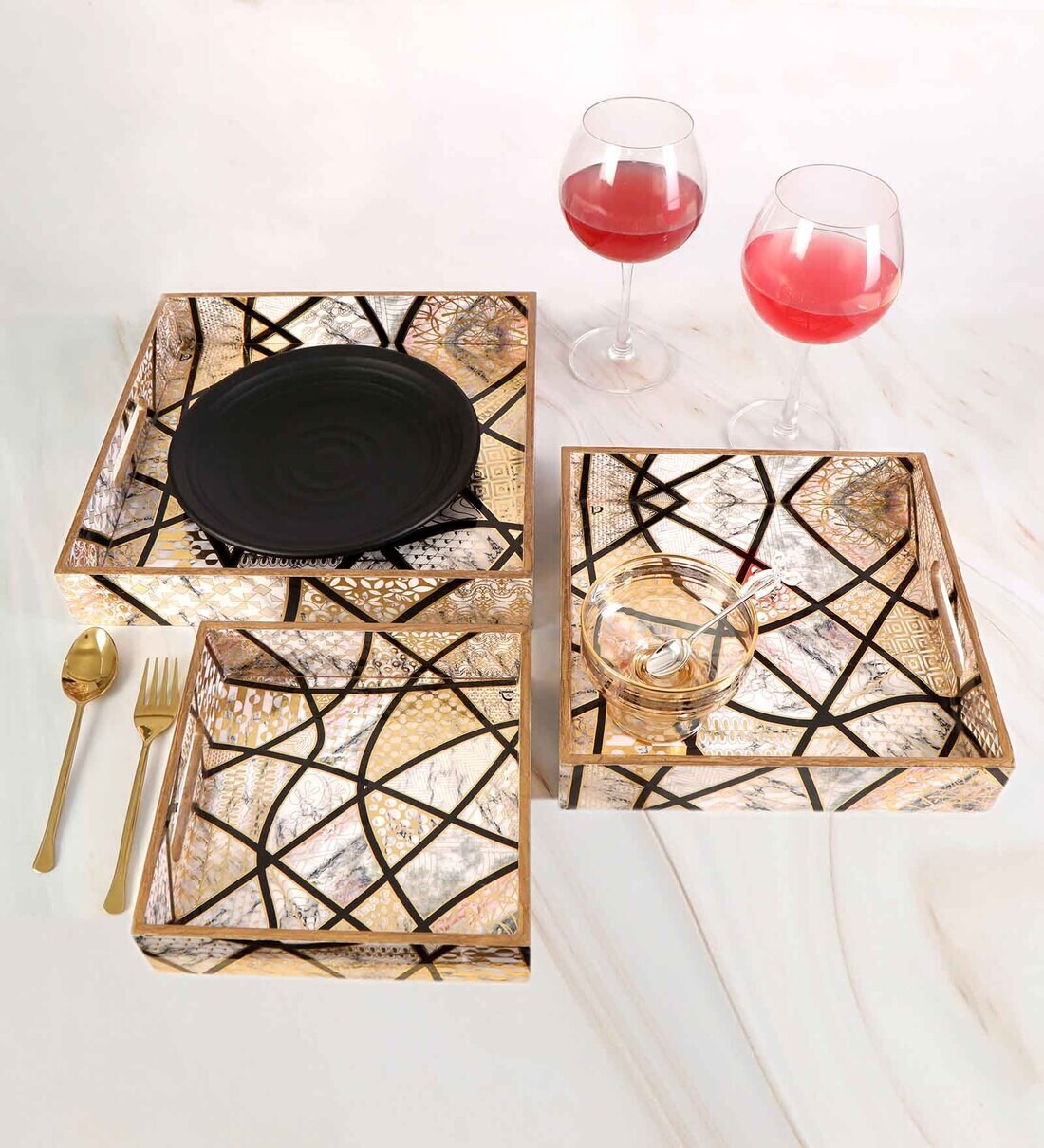 Black White & Gold MDF Wood Crisscross (Set of 3) Serving Tray