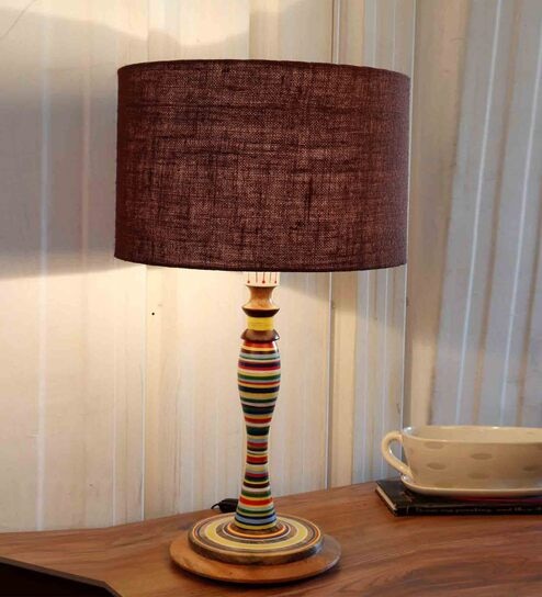 Bling Brown Fabric Shade Night Lamp With Wood Base