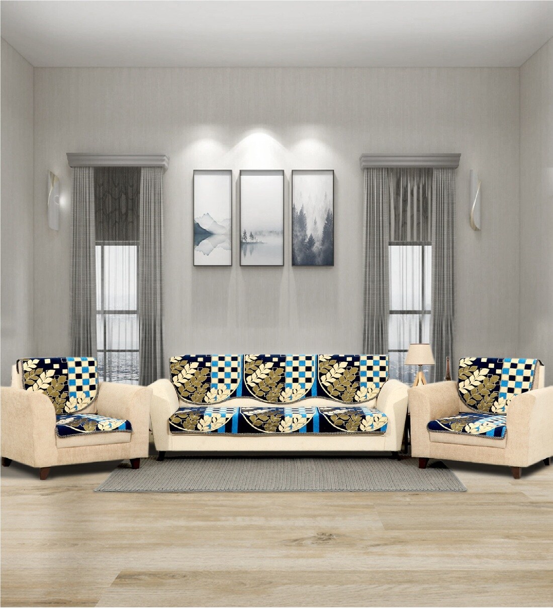 Blue 5 Seater Checkered 10Pcs Sofa Covers