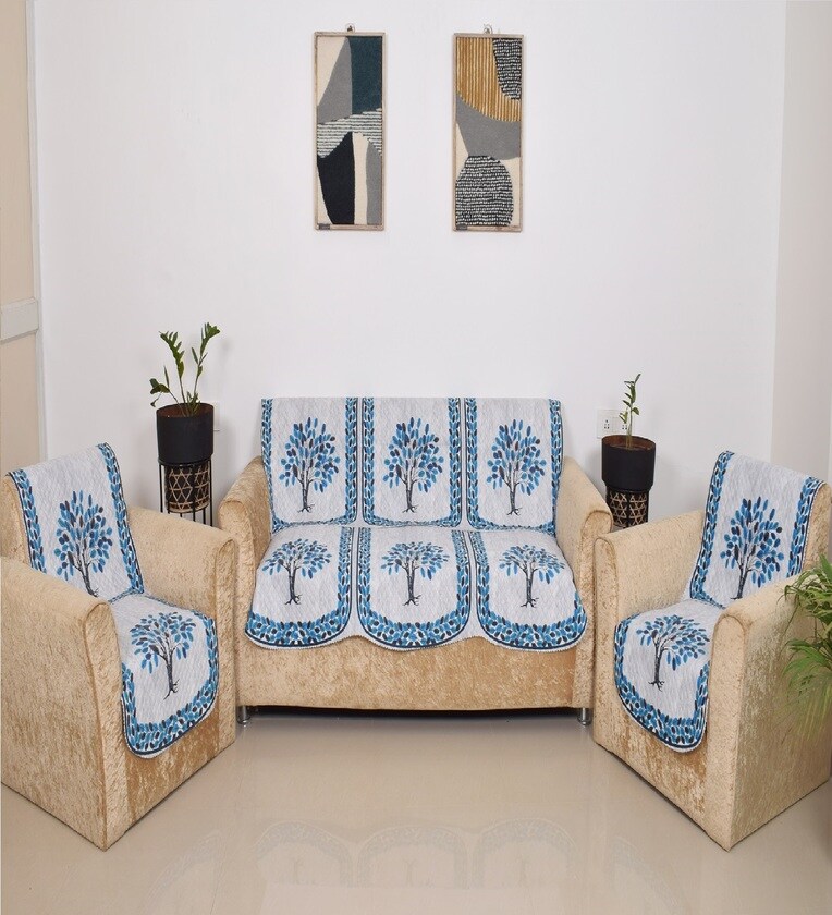 Blue 5 Seater Floral 10Pcs Sofa Covers