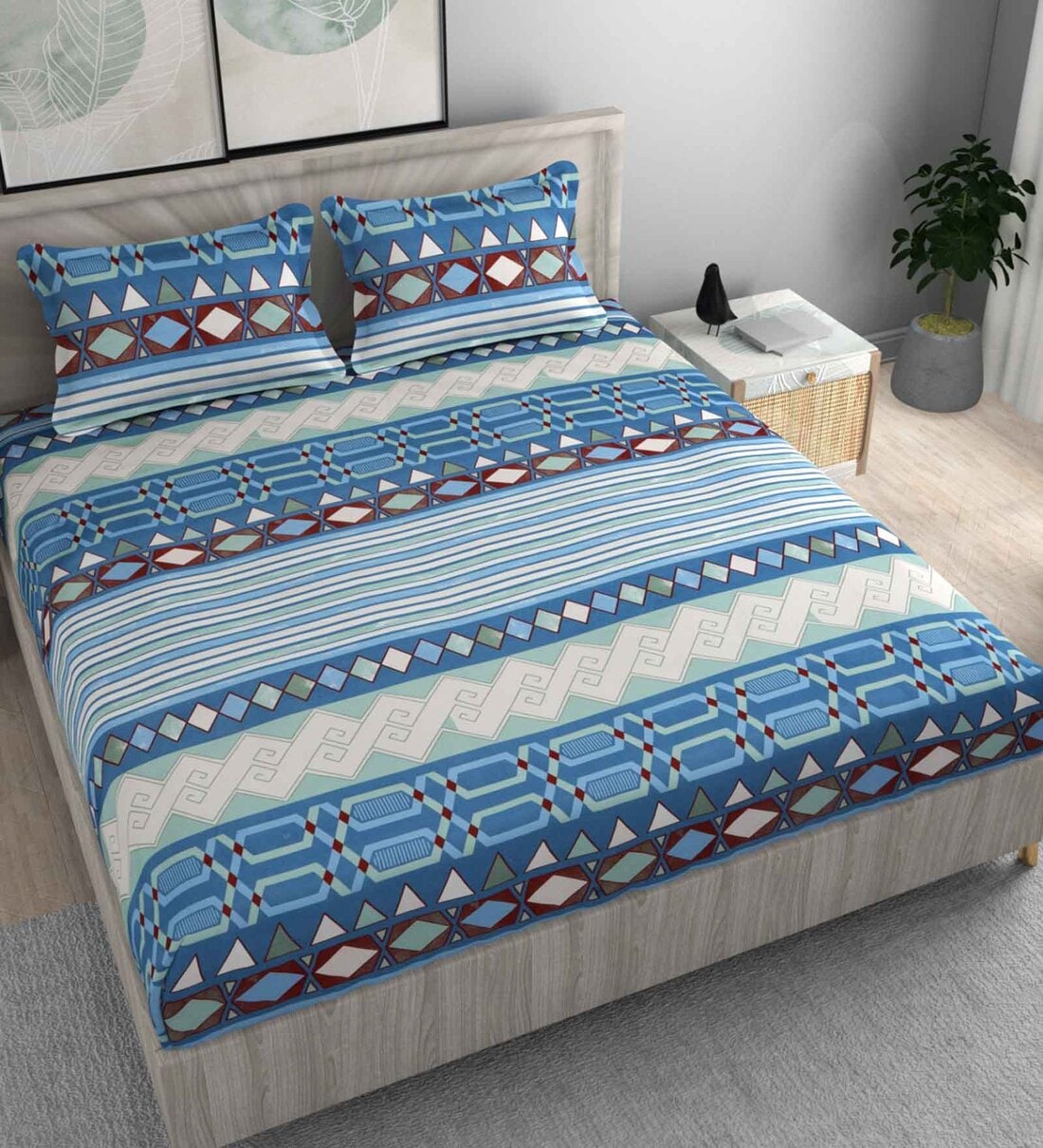 Blue Abstract 210 TC Microfiber King Sized Fitted Bedsheet With 2 Pillow Covers