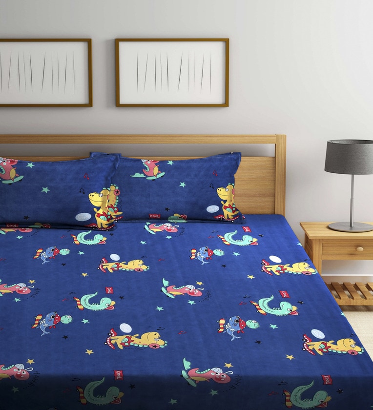 Blue Cartoon 300 TC Cotton Blend Double Bedsheet With 2 Pillow Covers