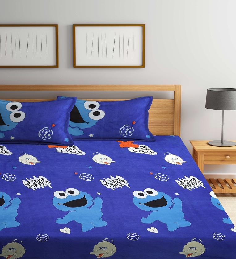Blue Cartoon 300 TC Cotton Blend Double Bedsheet With 2 Pillow Covers