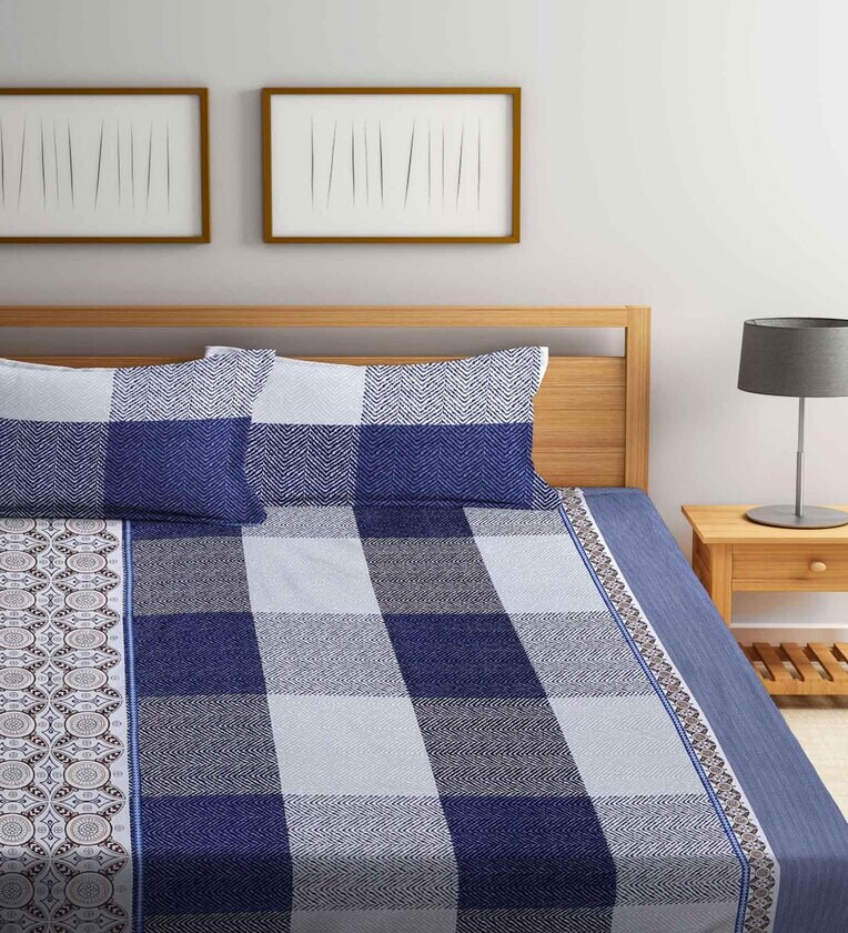 Blue Checkered 300 TC Cotton Blend Double King Sized Bedsheet With 2 Pillow Covers