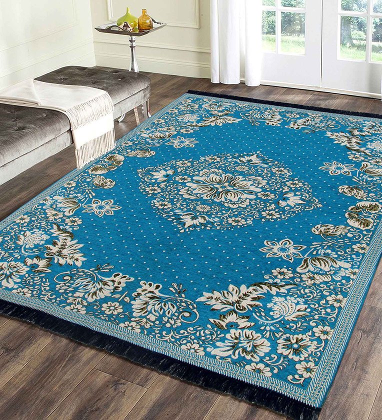 Blue Chenille Vintage 4 x 6 Feet Machine Made Carpet