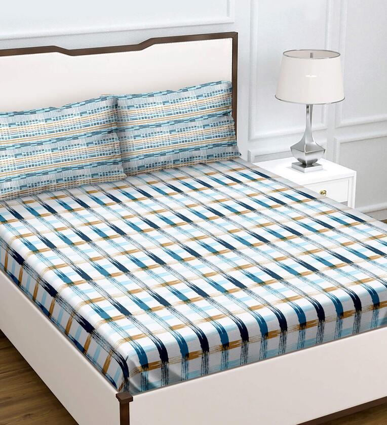 Blue Geometric 180 TC Cotton Queen Sized Bed Sheets with 2 Pillow Covers