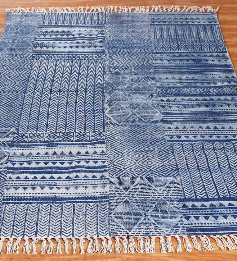 Blue Cotton Geometric 4x6 Hand Woven Dhurrie