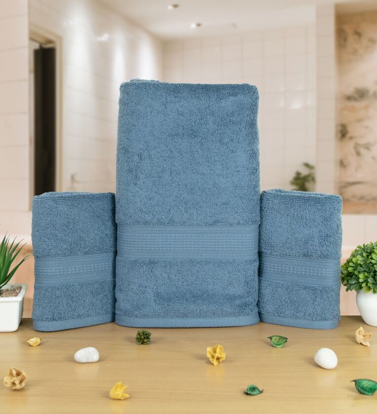 Blue Cotton Solid 500 GSM Bath & Hand Towels Pack of 3 (1Bath 2 Hand)