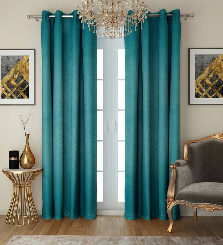Blue Faux Silk Blackout 9 Feet Eyelet Curtain (Set of 2)