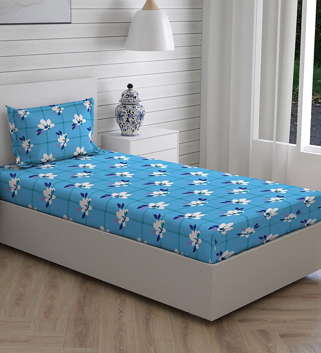 Blue Floral 104 TC Cotton Single Bed Sized Bed Sheets With 1 Pillow Cover