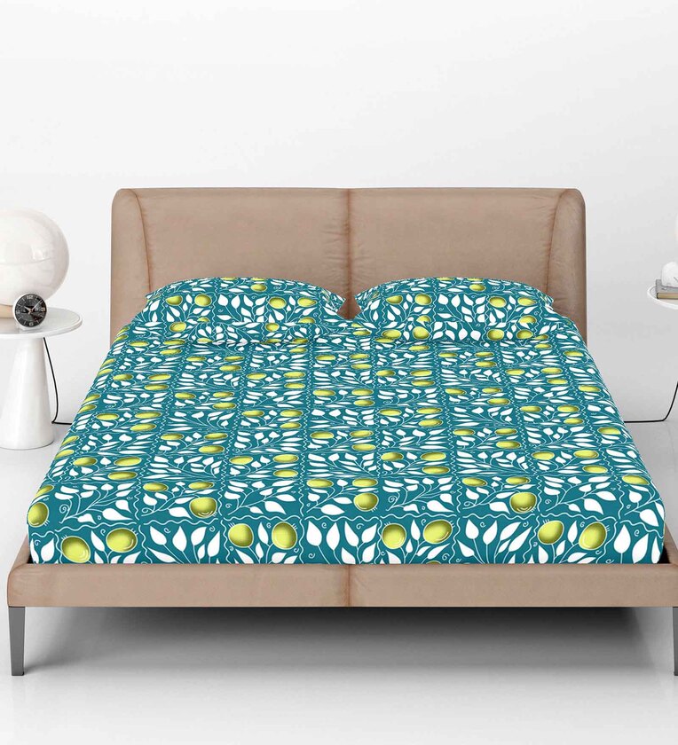Blue Floral 144 TC Cotton Fitted Double Bedsheet with 2 Pillow Covers