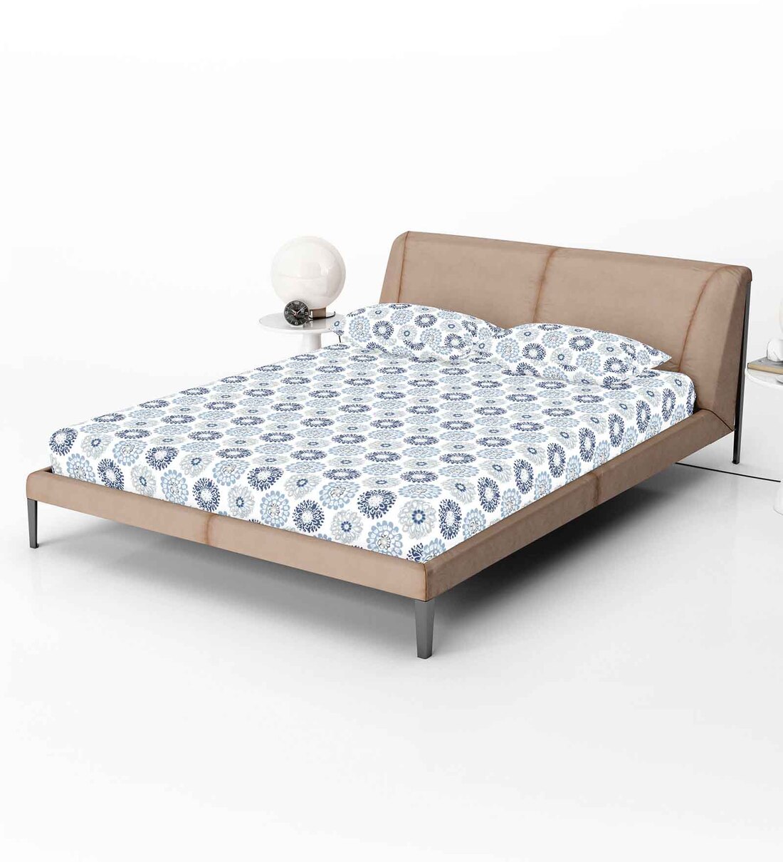 Blue Floral 144 TC Cotton Fitted Double Bedsheet with 2 Pillow Covers