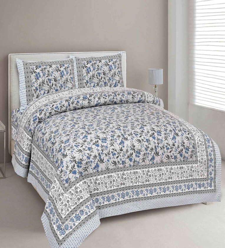 Blue Floral 144 TC Cotton King Bedsheet and 2 Pillow Cover