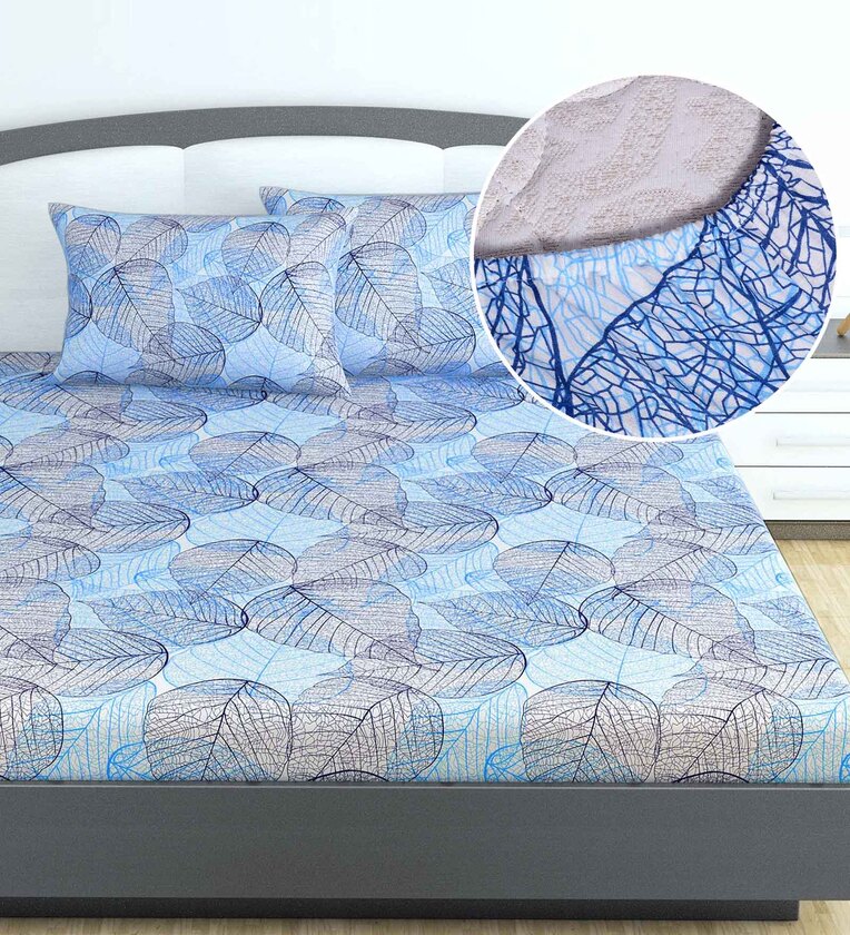 Blue Floral 144 TC Cotton King Fitted Bedsheet with 2 Pillow Covers