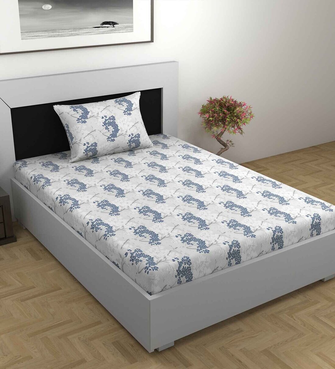 Blue Floral 144 TC Cotton Single Bedsheet with Pillow Cover