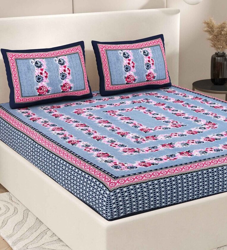 Blue Floral 200 TC Cotton Double Queen Sized Bedsheet With 2 Pillow Covers