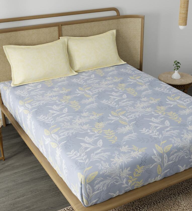Blue Floral 210 TC Microfiber Double King Size Bedsheet With 2 Pillow Covers