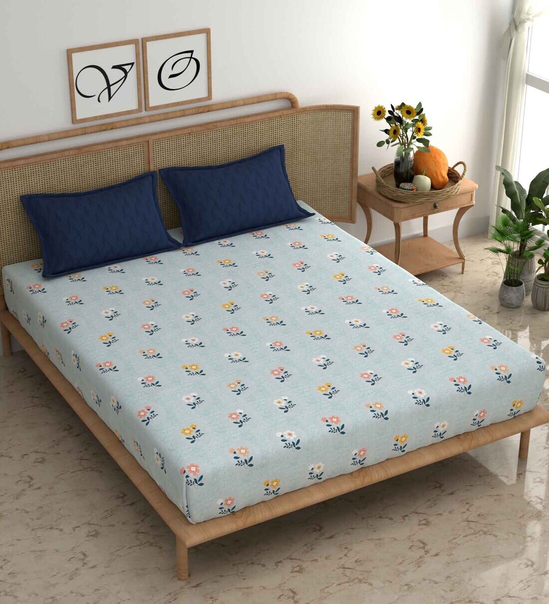 Blue Floral 210 TC Microfiber King Bedsheet With 2 Pillow Covers