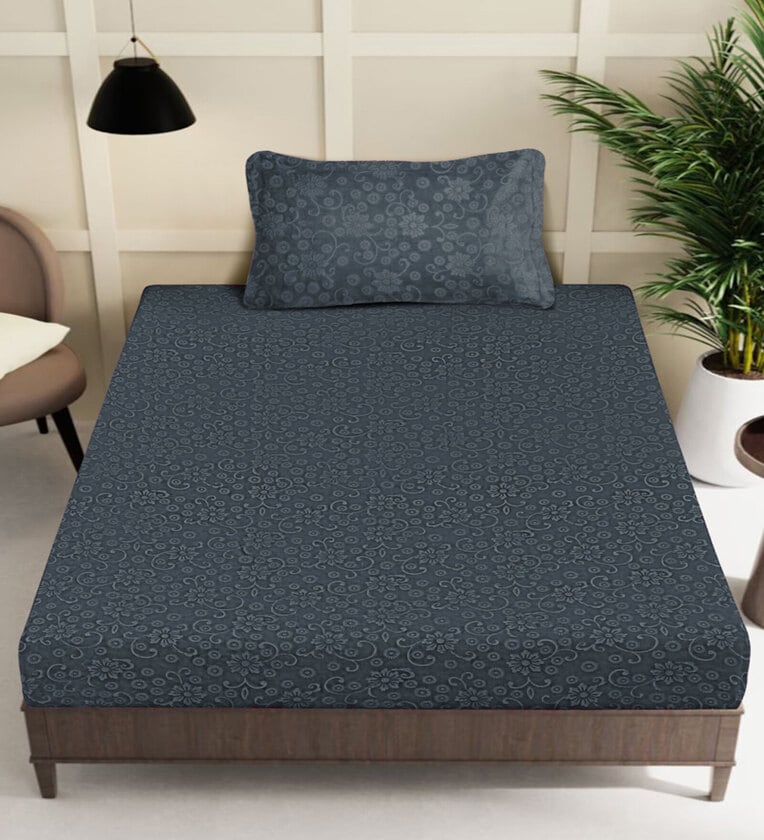 Blue Floral 300 TC Woollen Fitted Single Bedsheet with Pillow Cover