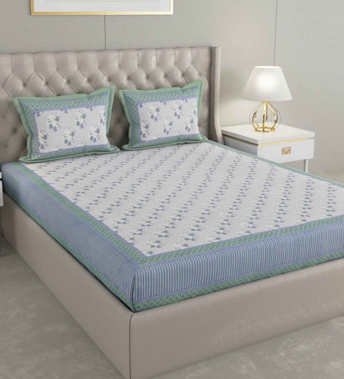 Blue Floral 600 TC Cotton Double King Sized Bedsheet With 2 Pillow Covers