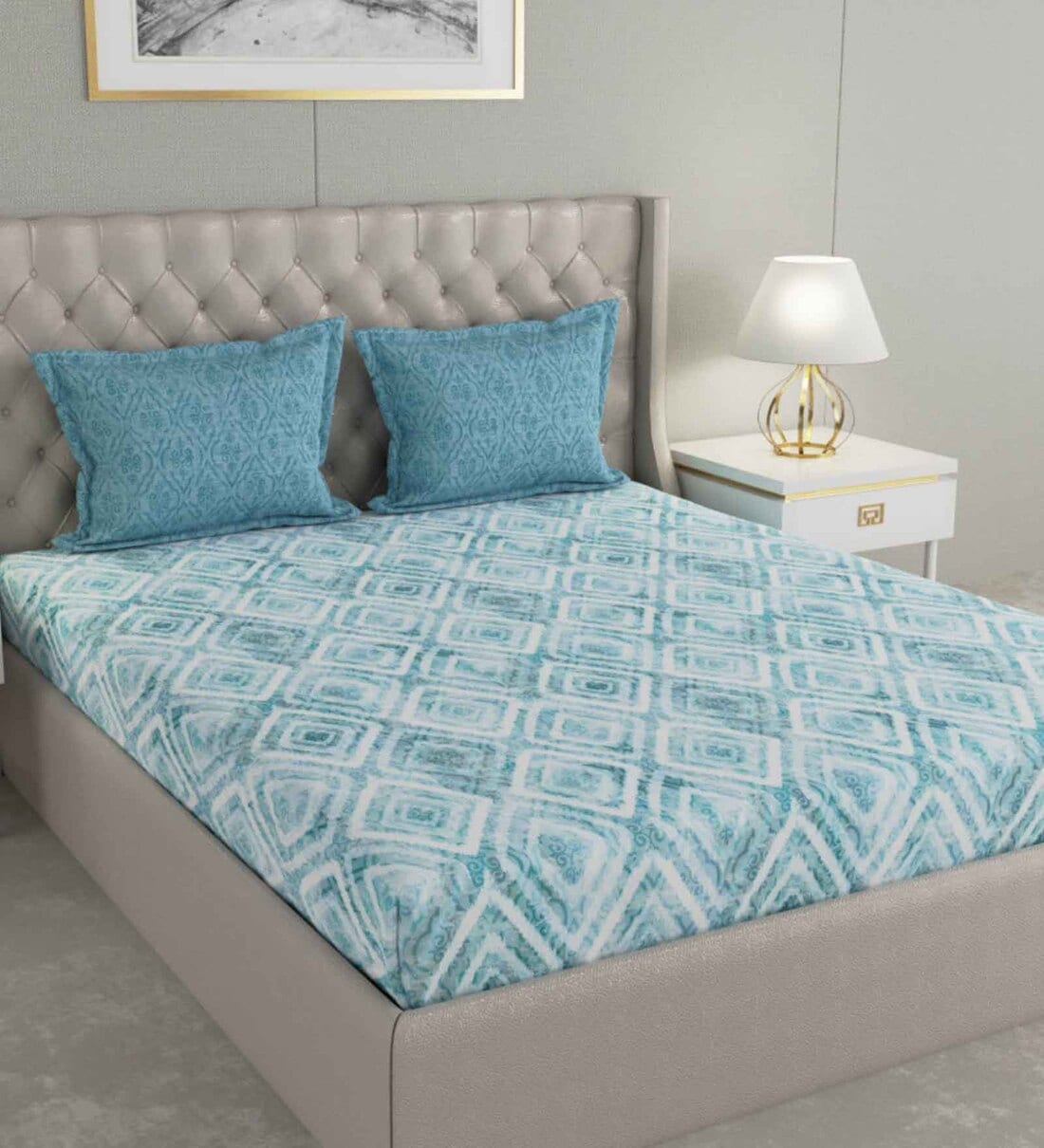 Blue Geometric 144 TC Cotton Queen Sized Bed Sheets with 2 Pillow Covers