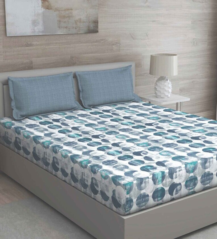 Blue Geometric 144 TC Cotton Queen Sized Bed Sheets with 2 Pillow Covers