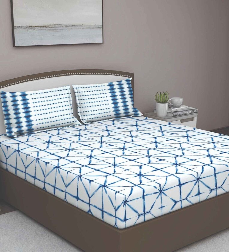 Blue Geometric 210 TC Cotton Queen Sized Bed Sheets with 2 Pillow Covers