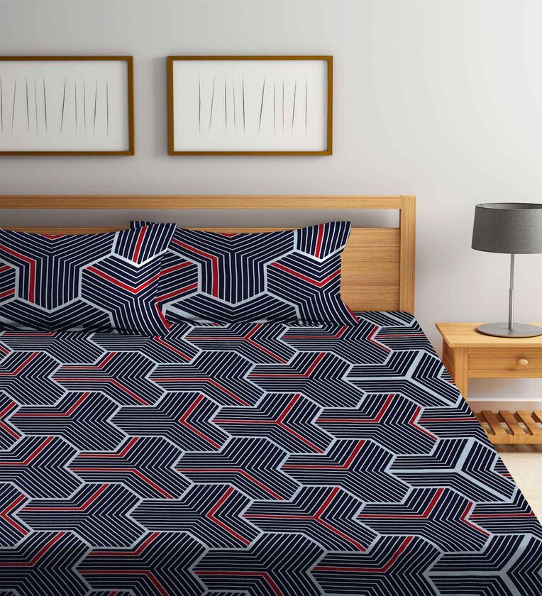 Blue Geometric 300 TC Cotton Blend Double King Sized Bedsheet With 2 Pillow Covers