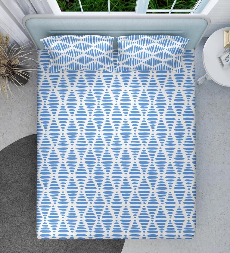 Blue Geometrical 144 TC Cotton King Sized Double Bedsheet with 2 Pillow Covers Pebble Drift Collection