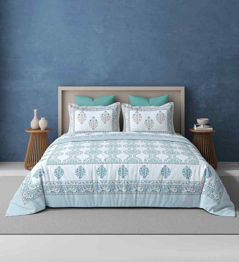 Blue Jaipuri Blockprint 250 TC Pure Cotton King Sized Double Bedsheet with 2 Pillow Covers