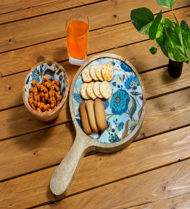 This round mango wood serving platter will allow you to create an eye-pleasing display of food. Beautifully handcrafted in a blue floral print with food safe enamel that makes it food gradable, longlasting and durable. It is best for serving nibbles, snacks and even pizza.
