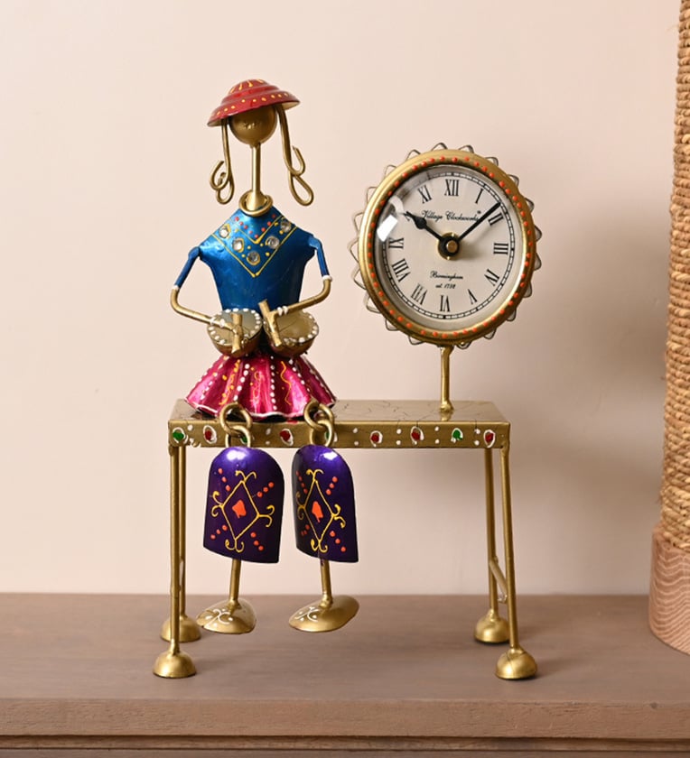 Authentic Handcrafted Metal Art with Clock Inspired by traditional folk musicians Rustic Traditional Finish Adds ethnic charm and artistic warmth to interiors Durable & Long-Lasting Build Premium metal construction for lasting beauty Perfect Home & Office D cor Ideal for shelves, tables, studios & display spaces Cultural Heritage Showpiece Brings Indian folk tradition into modern d cor Unique Gift Option Great for housewarming, festivals & art lovers Handcrafted by Skilled Artisans Each piece is unique and detailed