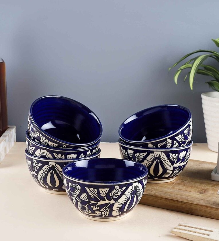 VarEesha presents the Kaarigari range of beautiful hand crafted ceramic dining accessories that showcase the magical handwork of Indian rural artisans. Each piece goes through the long process of clay baking, drawing, painting, re-baking and glazing. The pieces have contrasts, tones and intricate motifs & patterns that are inspired from our rich cultural heritage of the Mughal era. Every piece is pain stakingly hand painted uniquely and thus may differ slightly from each other in size, color and shape. These are made at high temperatures and this its not possible to predict the exact shade outcome. Ideal for daily and occasional use, these are microwave & dishwasher safe. Blue Mughal Hand Crafted Ceramic Veg Bowls Set is a part of this range that has six pieces measuring 4x2 inches in diaxh and with a capacity of 150 ml each. Made from premium lead free ceramic, these are completely food safe and excellent for gifting too.